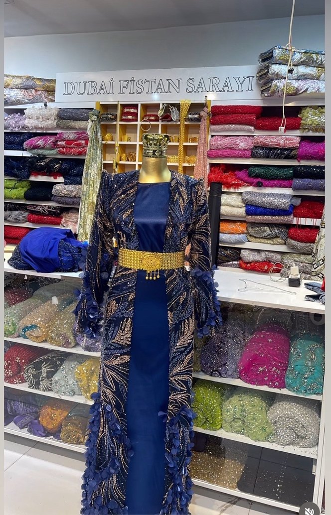 Uzun, mavi renkli bu elbise desenli ve drapeli tasarımıyla, uzun kollu ve kayık yaka detayına sahiptir. Düzenli kalıp, gösterişli bohem tarzda, parti için uygundur. Markası DUBAIFISTANSARAY.
