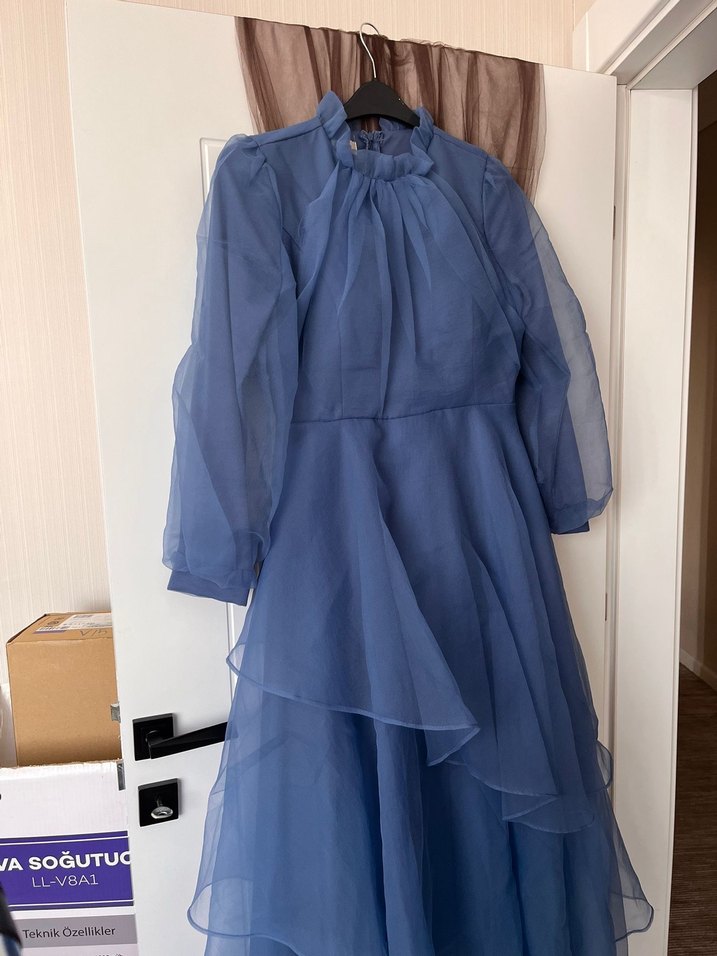 Uzun, bol kesim elbise, drapeli katmanlar ve yüksek yakaya sahiptir. Pastel mavi tonu ve uzun kollarıyla vintage bohem tarzını yansıtır, düğünler için uygundur. Arka etek kısmında yırtık vardır bir defa giyilmiştir