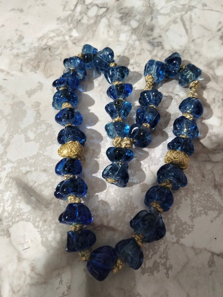Uzun boyda, koyu tonlu batik desenli mavi boncuklar ve altın detaylarla süslenmiş bohem kolye. Romantik akşamlar için ideal.