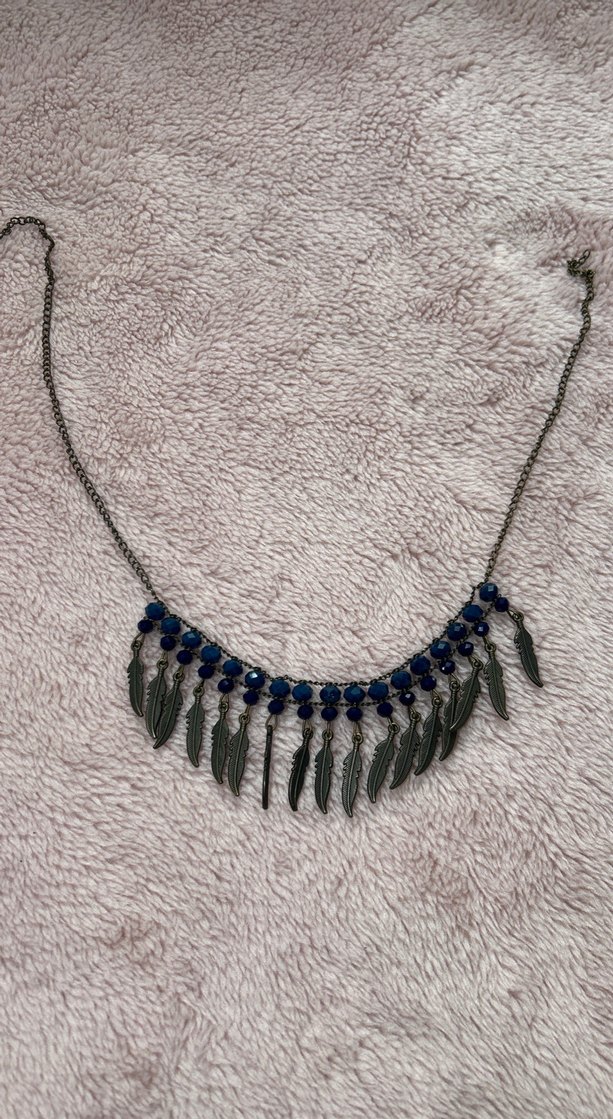 Uzun uzunlukta, mavi boncuklar ve işlemeli tüy detaylarına sahip bohem tarzda kolye. Günlük kullanıma uygun koyu renk tonlarıyla öne çıkar.