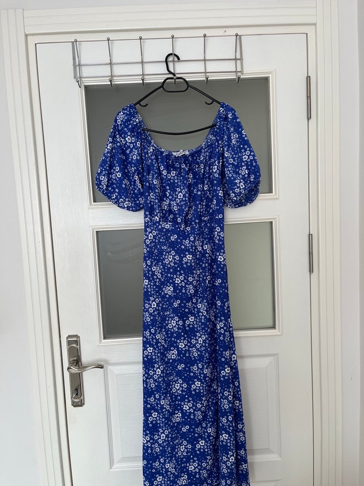 Uzun, mavi çiçek desenli elbise, bol kesim ve askılı kollara sahiptir. Bohem tarzı, renkli desen ve dökümlü yapısıyla öne çıkar. Yumuşak sentetik kumaştan üretilmiştir.