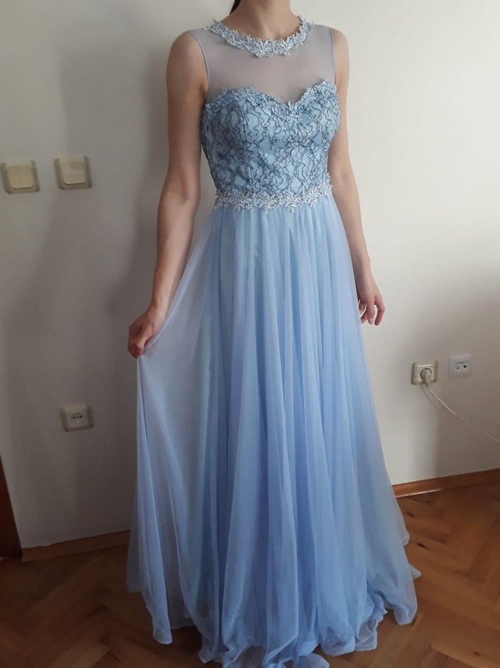 Uzun, pastel mavi renkte, dantel işlemeli straplez üst kısmı ve kolsuz, bol kesim eteği olan modern klasik tarzda abiye elbise. Düğün için uygundur. Bir kez giyildi