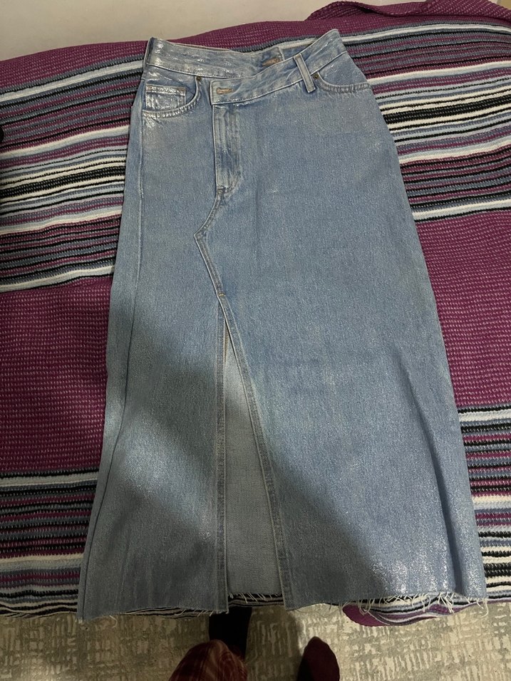 Bu uzun mavi denim etek, kemerli ve bol kesimdir. Günlük sokak stiline uygun, hafif batik desenlidir.