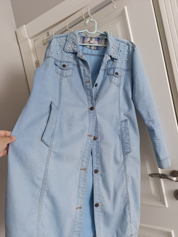 Uzun mavi denim ceket, çıtçıtlı ve yakasında inci detaylıdır. Uzun kollu, regular fit ve günlük kullanıma uygundur.