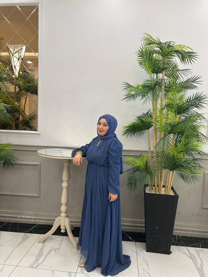 Uzun Mavi Dökümlü Tesettür Elbise