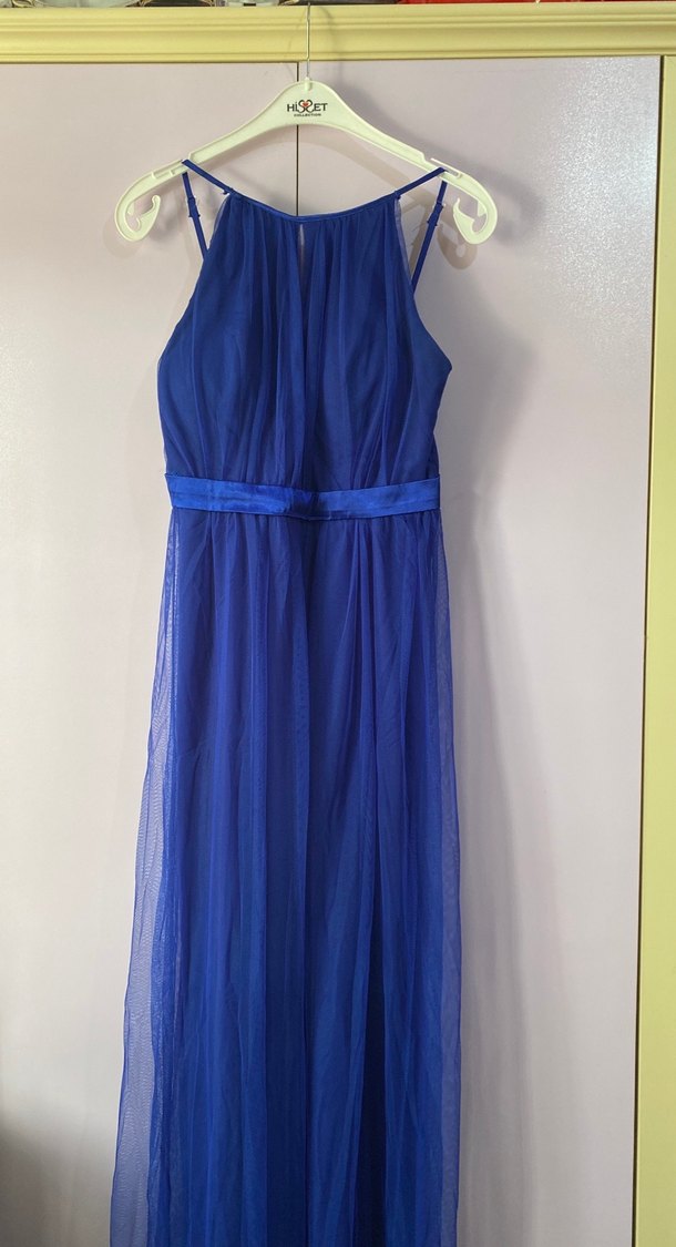 Yüksek yakalı, askılı ve drapeli detaylara sahip uzun Mavi abiye elbise, düğünler için uygundur.