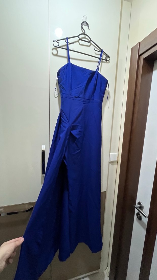 Bu uzun mavi abiye elbise, askısız yakası ve drapeli detaylarıyla şık bir görünüm sunar. İnce askılı, parlak kumaştan, parti için uygundur.