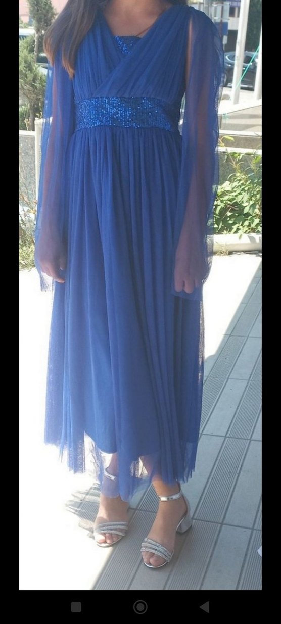 Uzun mavi abiye elbise, drapeli ve bol kesimdir. Askılı kollu, V yaka ve parlak dokusuyla bohem tarzda düğünlere uygundur. ✨