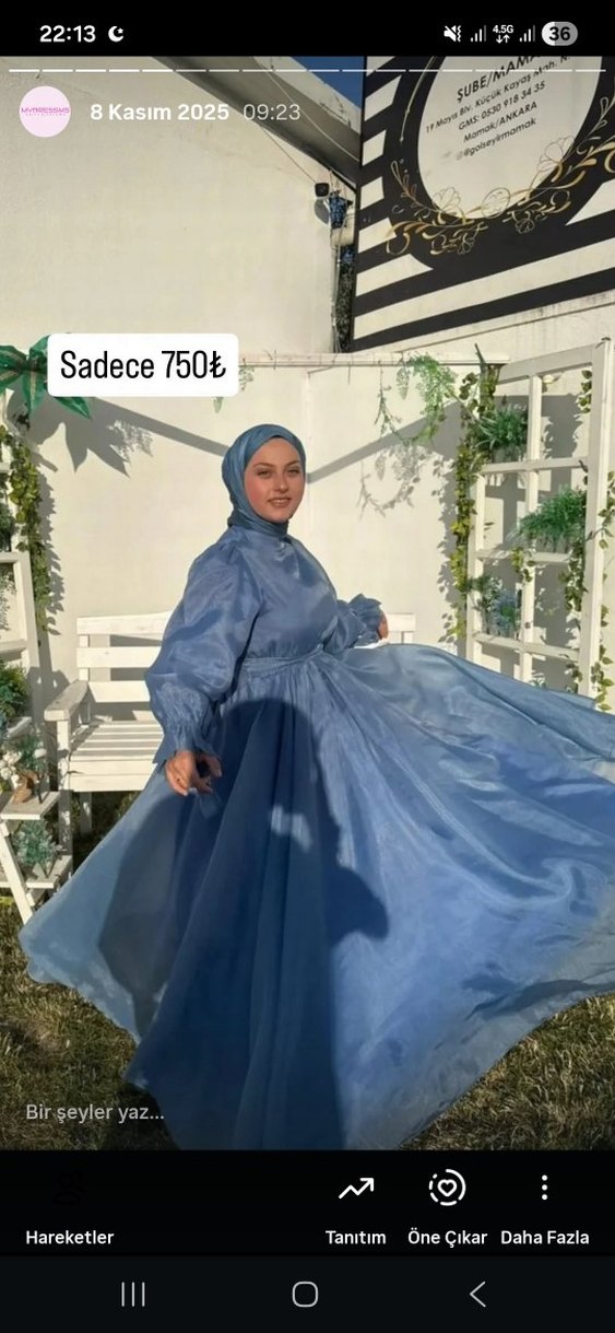 Parlak tie-dye desenli, uzun mavi abiye; yüksek yakalı, uzun kollu, bol kesim ve drapeli stilde, düğünler için ideal. Sadece 750₺.
