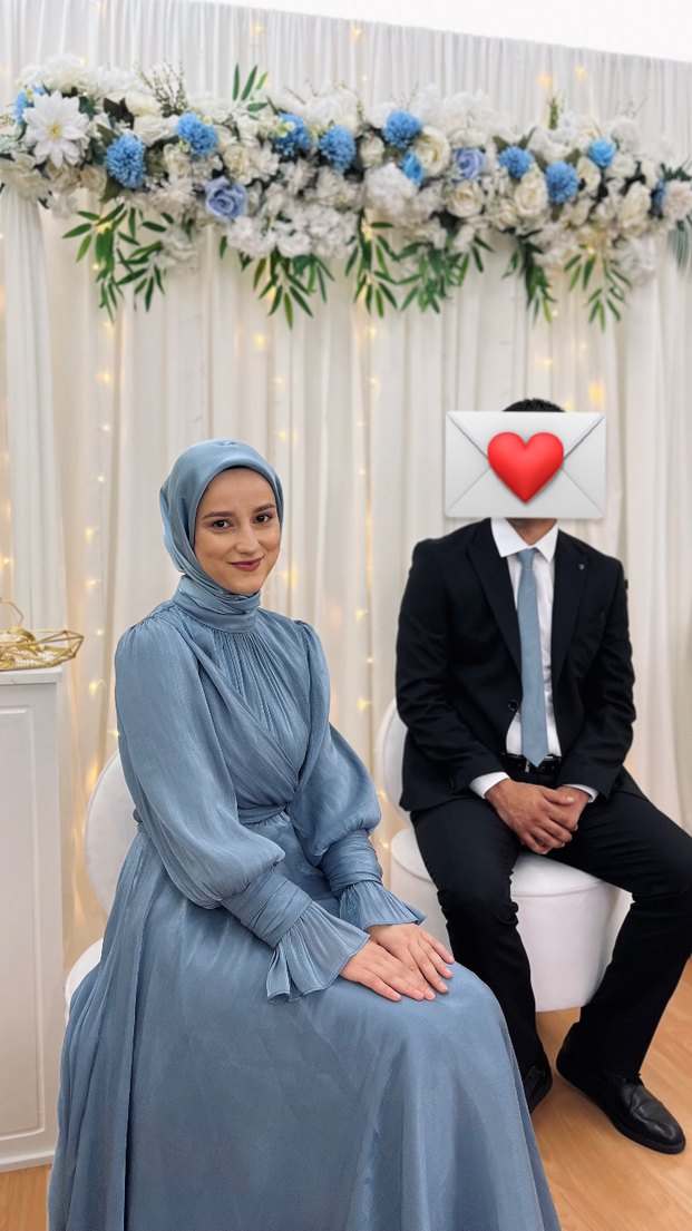 Uzun mavi drapeli elbise, etnik desenli, uzun kollu ve notched lapel yakalıdır. Düğün için uygun, rahat kesim ve modest stilde bir tasarımdır.