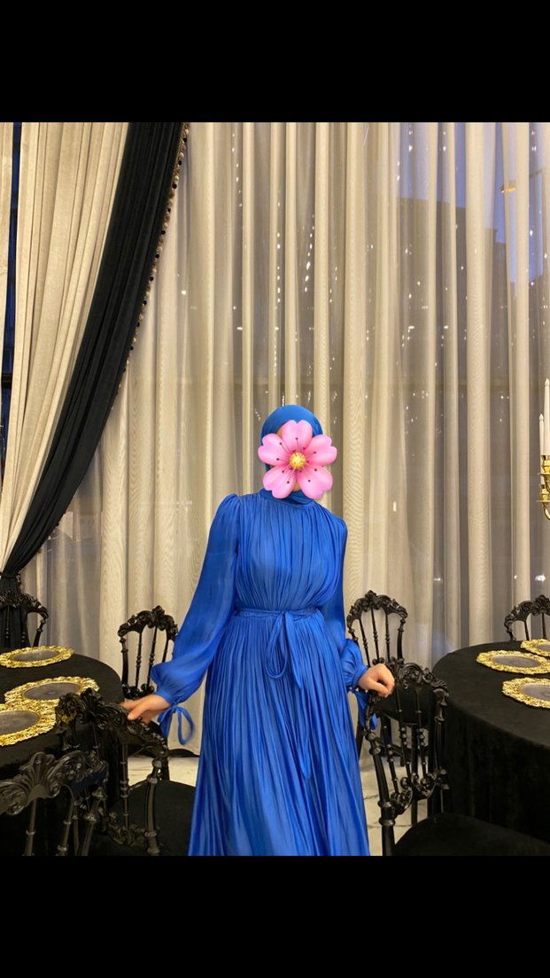 Yüksek yakalı, drapeli ve fitted bel detaylı uzun mavi abiye. Uzun kollu ve çiçek desenli, mütevazı ve bohem parti tarzına uygun. Aynı renk şalı ile beraber gönderilecektir.