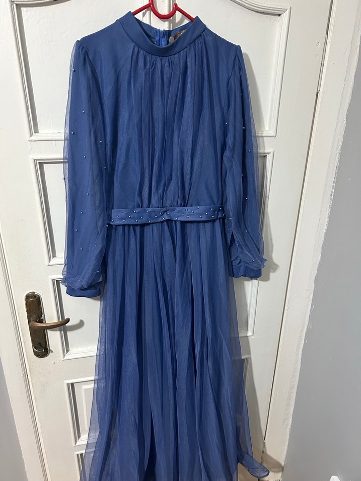 Uzun mavi renkte, yüksek yakalı ve askılı kollu, bol kesim drapeli kadın abiye elbisedir. Minimalist ve modern klasik tarzda, düğün için uygundur. Desensiz ve kemer detaylıdır.
