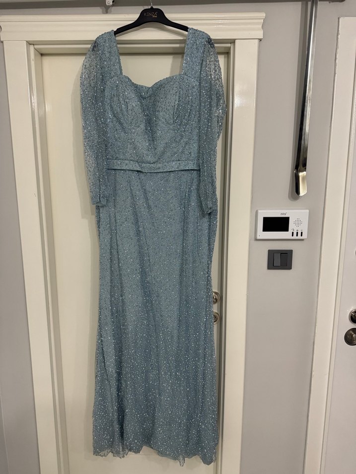 Drapeli ve tekne yaka detaylı, uzun ve vücuda oturan bu abiye elbise, ince askılı kollara ve mavi-gri parlaklığa sahiptir. Düğünler için uygundur. Işıl ışıldıııırr Barbie bebek gibi olursunuz giyince 2 saat düğün için giyildi sorunsuzdur.