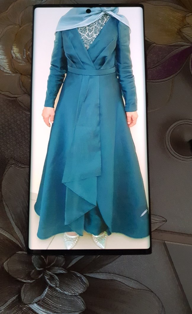 Uzun boylu, koyu mavi renkte, yüksek yakalı ve uzun kollu, bol kesim bir abiye. Drapeli tasarımıyla çağdaş ve sade bir şıklık sunar, düğünlere uygundur.
