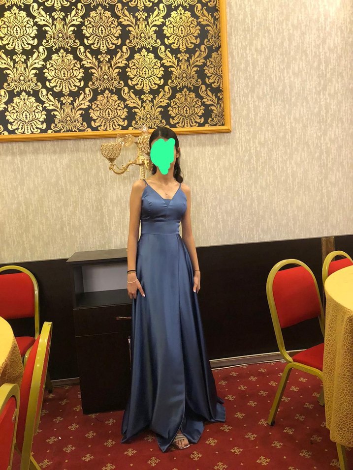 Uzun mavi renkli, drapeli tasarıma sahip, V yaka ve ince askılı, düz saten kumaştan yapılmış klasik modern tarzda kadın abiye elbise.