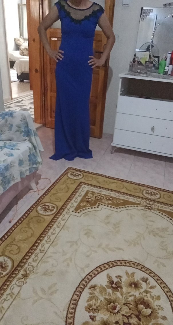 Fitted kesim, kolsuz, koyu mavi renkli, drapeli ve V yakalı kadın elbisesi, düğünler için uygundur. yakasında dantel detayı var sadece bir kere giyildi hiçbir kusuru Yok
