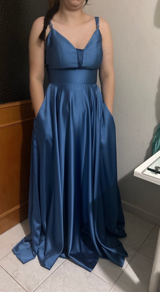 Parlak mavi kumaştan, drapeli uzun ve v yakalı, askılı, klasik kesim abiye elbise. Düğünler için uygun şık bir model. Hiç giyilmedi. Marka temsilidir.