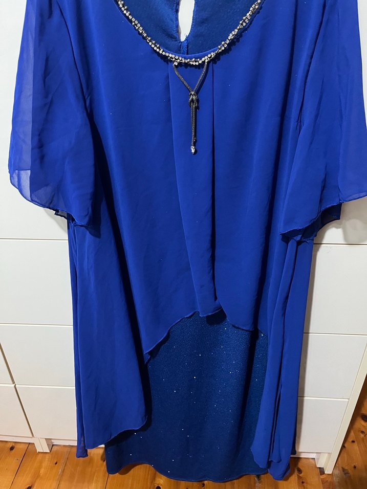 Uzun, parlak mavi renkte, drapeli tasarımlı, bol kesim ve kısa kollu kadın gece elbisesi. V yakalı, minimalist gotik tarzda, romantik akşamlar için uygun.