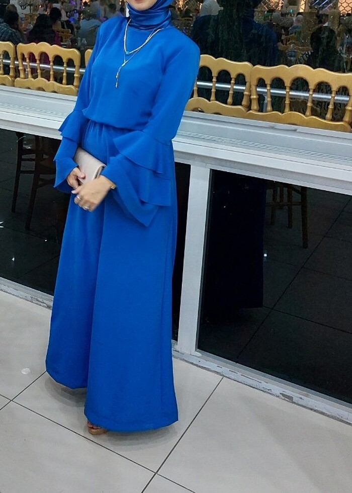 Uzun mavi kollari volanli çok şık elbise s-m bedene uygun. Marka temsili