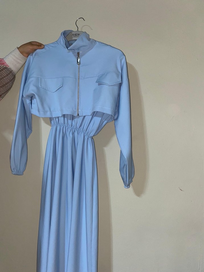 Pastel mavi renkte, uzun ve salaş kesim elbise. Yüksek yakalı, uzun kollu ve fermuarlı ön detayına sahip. Elastik bel ile rahatlık sağlar, sentetik kumaştan üretilmiştir.