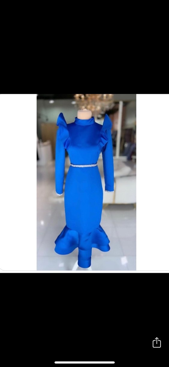 Özel dikim ,Uzun mavi abiye elbise, yüksek yakalı ve uzun kollu. Omuz ve etek uçlarında fırfır detayları bulunur. Parlak kumaş ve regular fit kesim, düğünler için uygun.