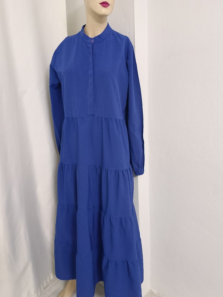 Yüksek yakalı, uzun kollu ve bol kesimli bu uzun mavi elbise, fırfır detaylarıyla minimalist bohem tarzını yansıtır.