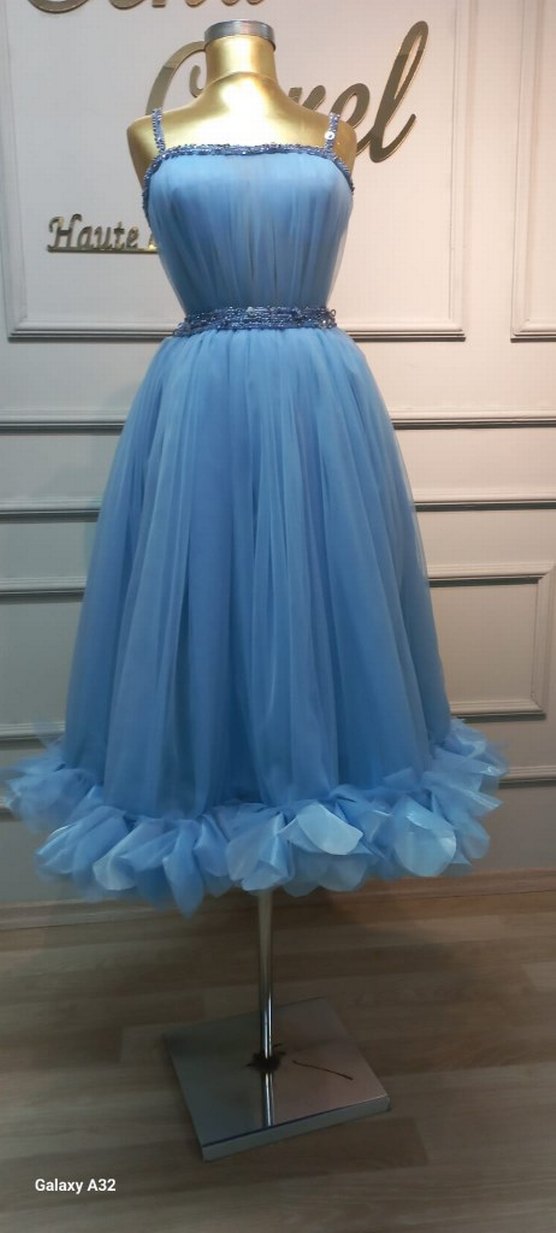 Midi boy, mavi renkte, askılı kare yaka detaylı abiye elbise. Etek ucunda fırfır detayları ve bele oturan süslemeler bulunur. Düğünler için uygun. 36/38 beden için uygun.