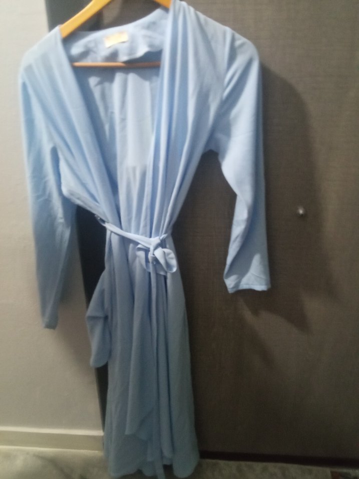 Uzun, bol kesim kadın bornoz, pastel mavi renkte ve minimalist tasarıma sahiptir. Askılı kollu ve kuşaklıdır, sade ve rahat bir görünüm sunar.