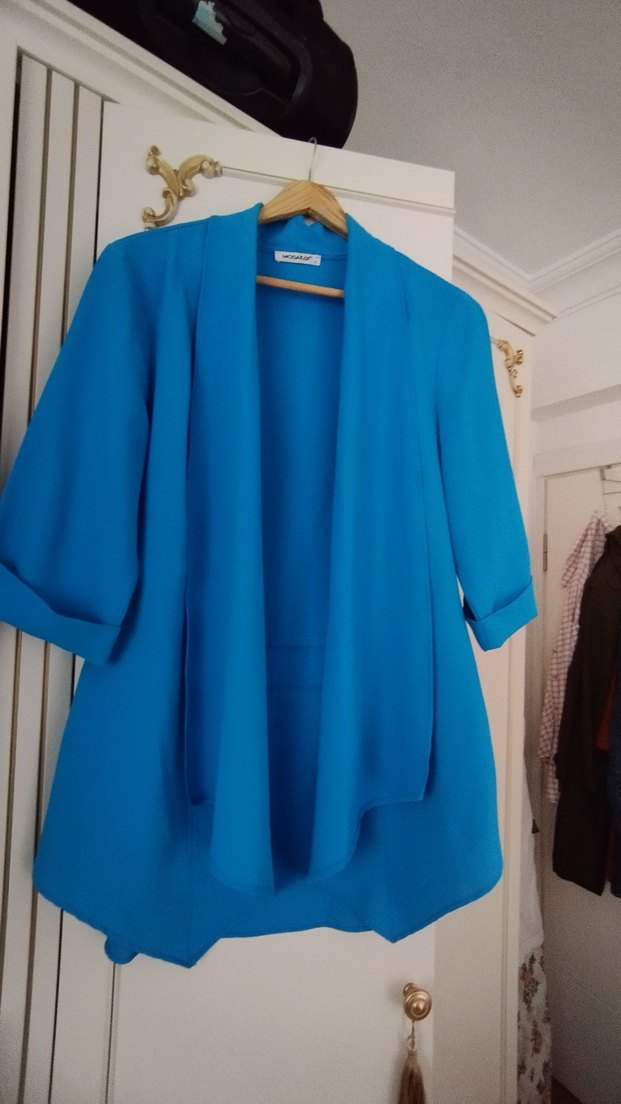 Uzun, bol kesim kadın ceket, yakası kesik ve dökümlü tasarıma sahip. İpeksi kumaştan, parlak mavi renkte, uzun kollu, ofis için uygun.