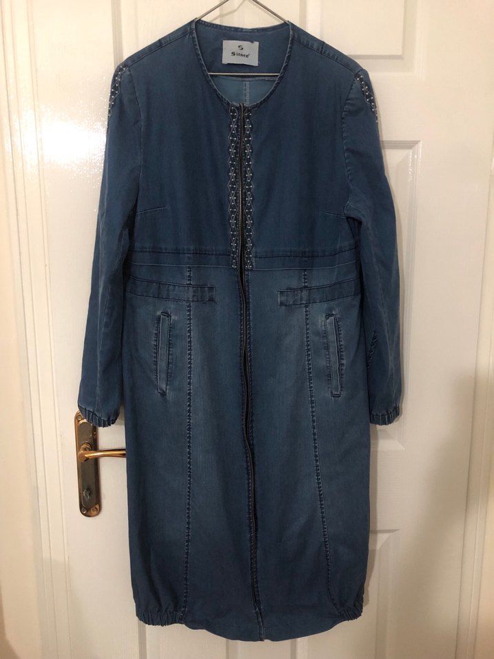 Uzun, bol kesim mavi denim ceket, düğmeli ön kısmı ile. Notlu yaka ve uzun kollu, günlük kullanıma uygun. ✨ Çok az kullanıldı sadece malesef fermuarı bozuldu onun dışında deformu yoktur.