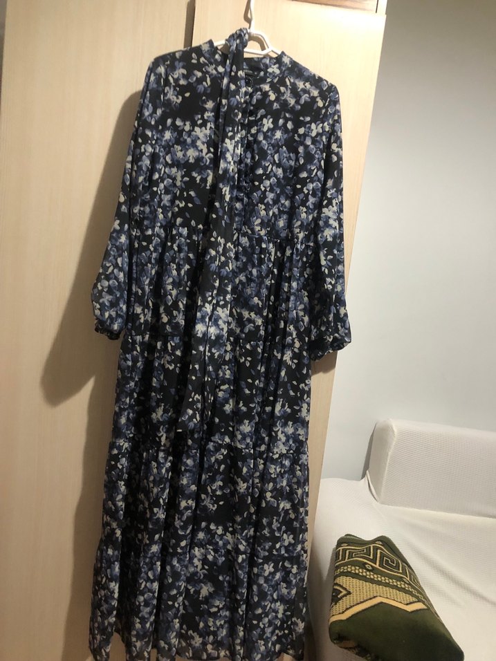 Uzun boy, bol kesim, yüksek yakalı ve askılı kollu mavi bohem elbise. Koyu tonlarda batik deseni ve drapeli tasarımı ile dikkat çeker.
