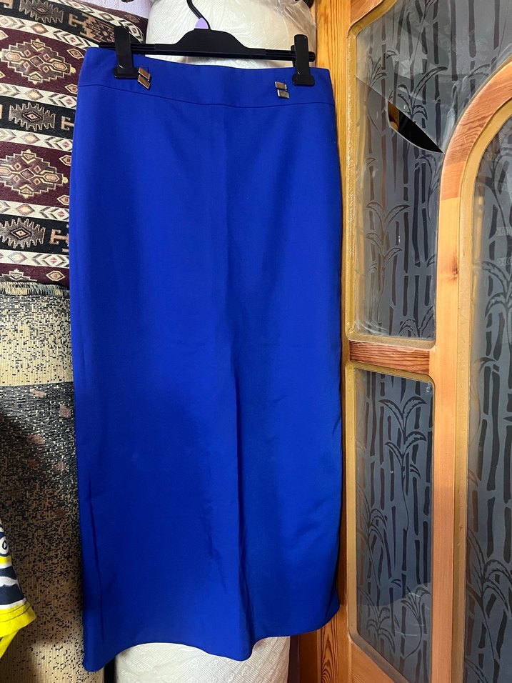 Uzun, mavi renkli kadın eteği, regular kesim ve parlak, ipeksi kumaşla drapeli tasarıma sahiptir. Ofis için şık ve modern bir seçim.