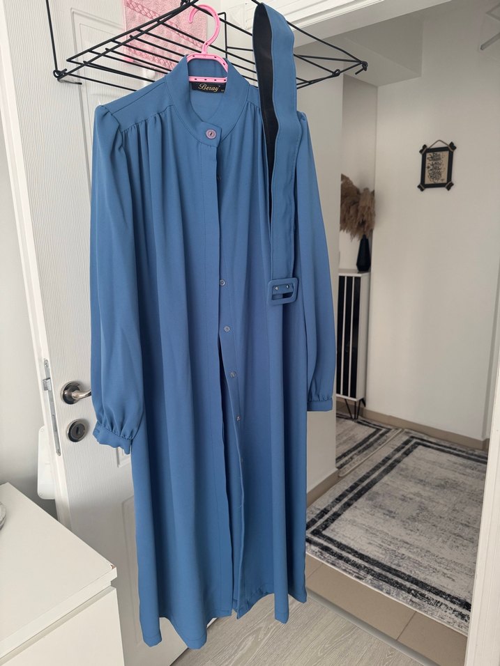 Uzun, bol kesim kadın gömlek elbisesi, uzun kollu ve minimalist sokak tarzında, düz mavi renktedir. Rahat bir kullanım sunar. İyi durumda 36 beden