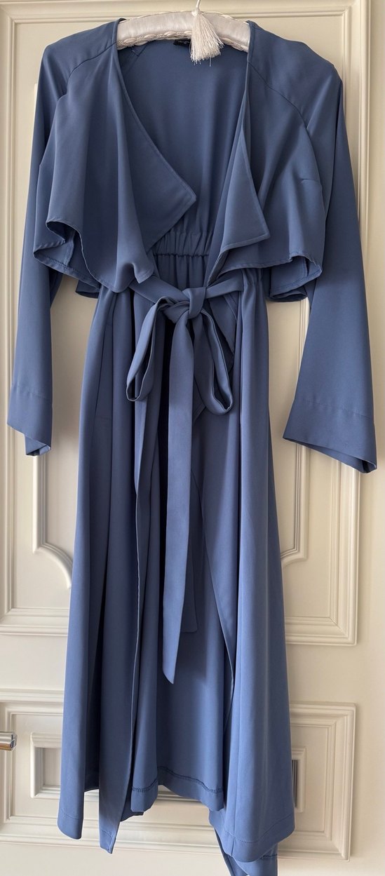 Uzun mavi renkli kadın kap, bol kesim ve askılı kollara sahip, modern klasik Paris tarzını yansıtıyor. Desensiz ve yumuşak kumaftan. Bol kesimdir beli lastiklidir rahat kullanım.
