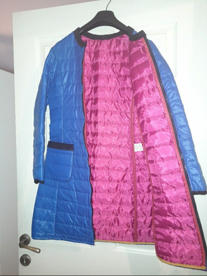 Uzun, mavi renkli kadın kışlık mont, fitted kesim ve kesik yakaya sahip. Renkli sentetik kumaştan, fermuarlı ve parlak pembe astarlı. Günlük kullanıma uygun. ❄️