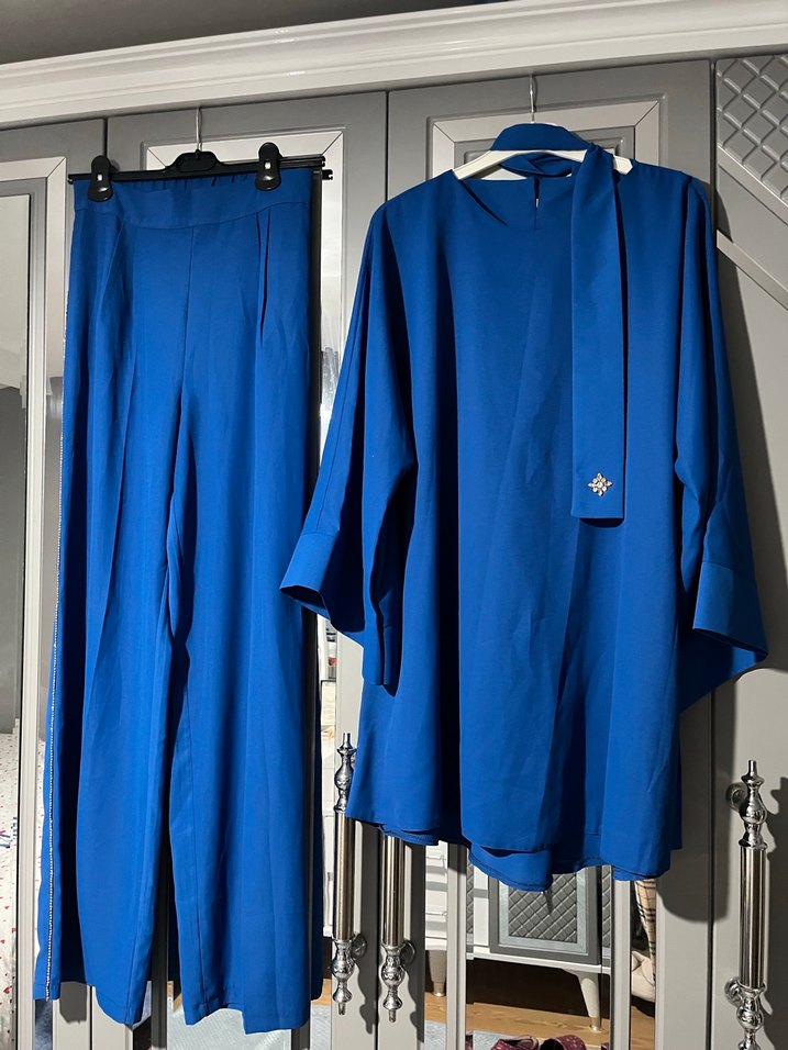 Uzun mavi kadın takım elbise, regular fit ve dökümlü ipeksi kumaşla. Çentikli yaka ve uzun kollu, parlak ve minimalist tarzda, ofis için uygundur. 1 beden yazıyor fakat geniş kalıptır 40-42 bedenede olur ufacık bir ip çekmesi var son resimde mevcut