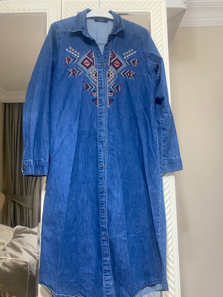 Bu uzun mavi denim ceket, nakışlı desenlere ve yaka kısmında kesik detaya sahiptir. Bol kesim, uzun kollu ve düğmeli olup bohem tarzını yansıtır. Günlük kullanıma uygundur. 105 ön uzunluk 109 arka kot ceket m beden koltukaltı 50 cm