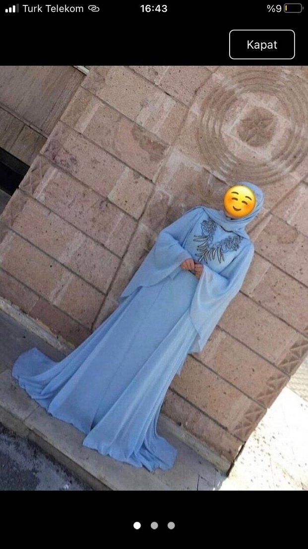 Uzun, bol kesim mavi abiye, drapeli kumaş ve detaylı nakışlara sahiptir. Yüksek yakalı ve uzun kolludur, tesettüre uygundur. Pastel tonlu bohem gotik tarzı yansıtır.