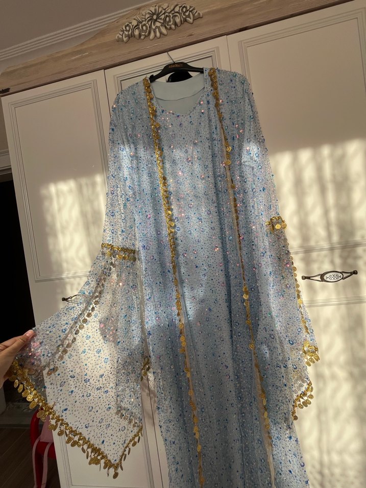 Uzun kollu, açık mavi renkte, nakışlı desenli ve dökümlü bol kesim bohem tarzda kadın hint elbisesi. Yuvarlak yaka ve düğünler için uygun. Sadece ön tarafta biraz sökülmüş ondan hariç hiçbir sorun yoktur