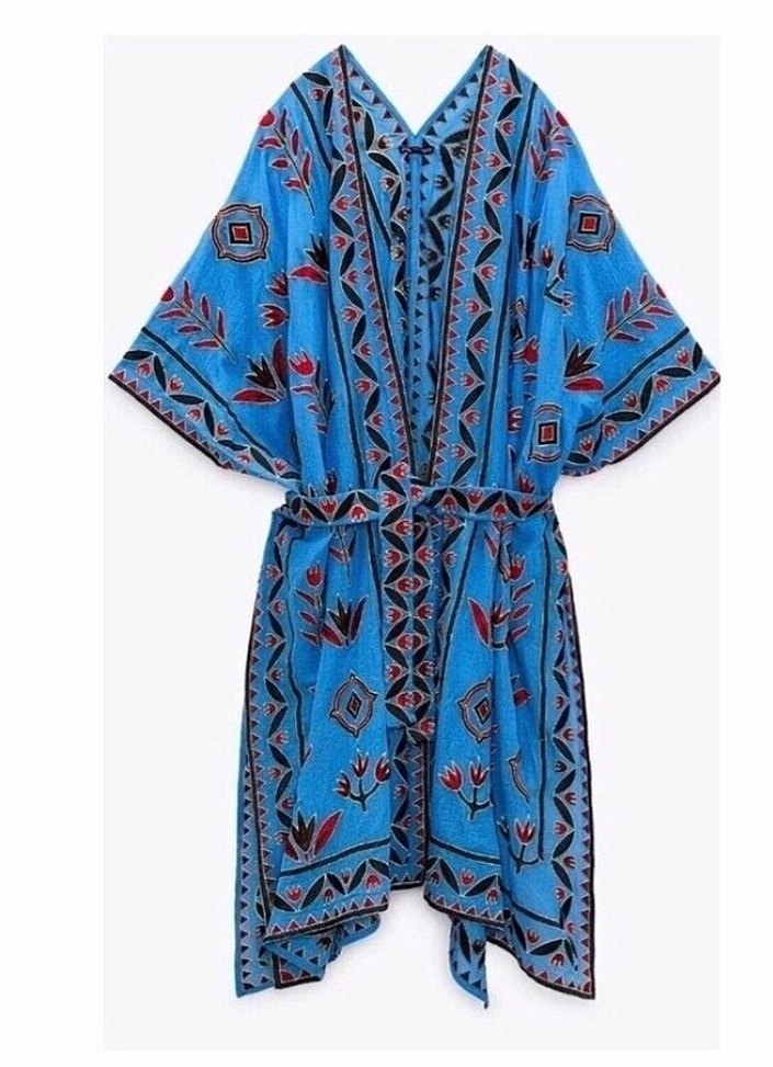 Uzun, mavi renkli kadın sabahlık, renkli nakış desenleri ve bol kesimiyle dikkat çekiyor. Uzun kollu ve bohem tarzda, kemerle ayarlanabilir.