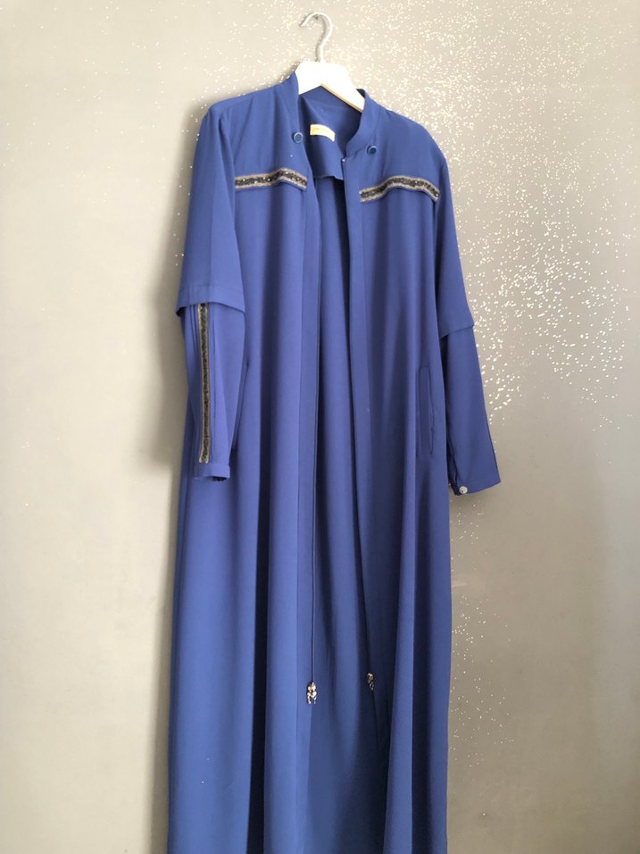 Uzun kol ve parlak nakış detaylarına sahip, minimalist sokak stili için uygun uzun mavi kadın elbisesi. ✨