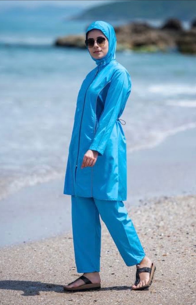 İç göstermez,parlak mavi renkte,yüksek yakalı boneli ve uzun kollu içi fileli paçaları ayarlanabilir büyük beden kadın tesettür mayo. Sentetik kumaştan, rahat kesim ve sportif şık tasarım sunar.ölçüleri mevcuttur