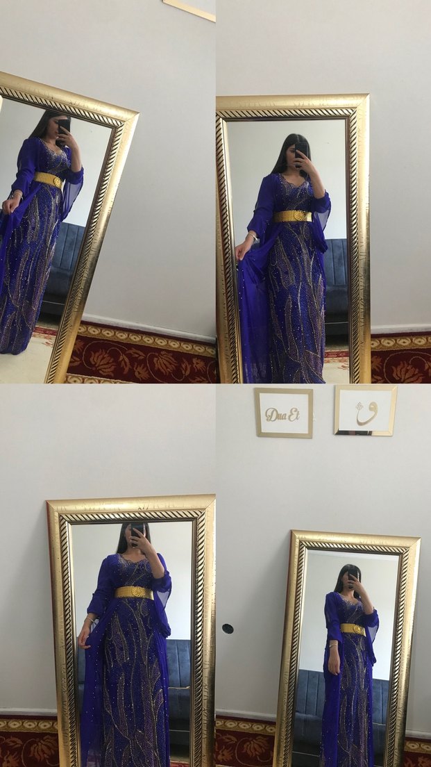 Uzun Mavi Saten Drapeli V Yaka yöresel elbise