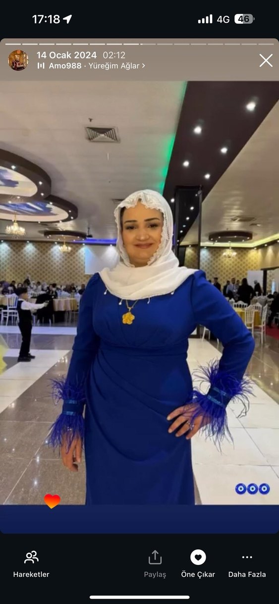 Yüksek yakalı, tüy detaylı uzun kollu, etnik desenli mavi uzun tesettür abiye elbise, düğünler için uygun.