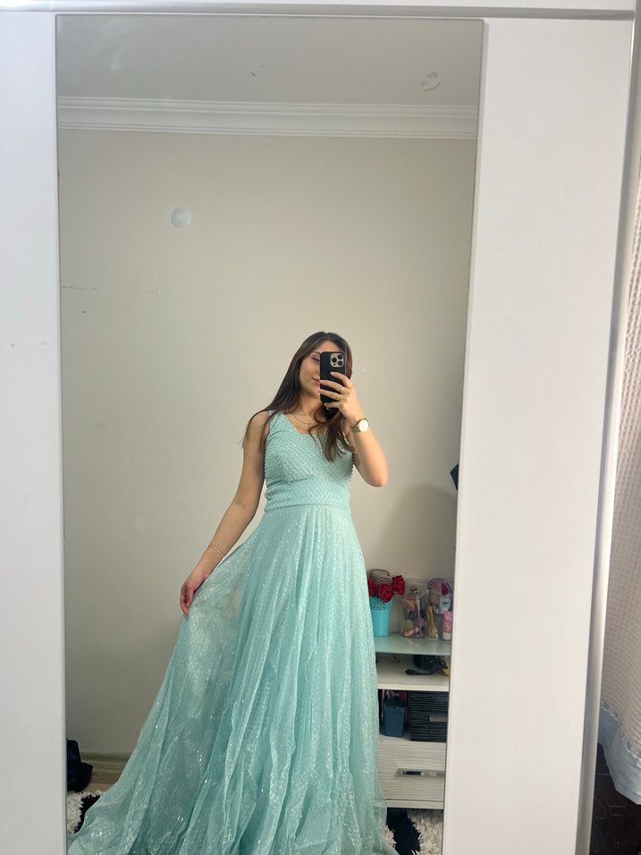 Uzun, mavi renkli, transparan detaylı ve V yakalı, kolsuz, desen içermeyen klasik şıklıkta kadın abiyesi.