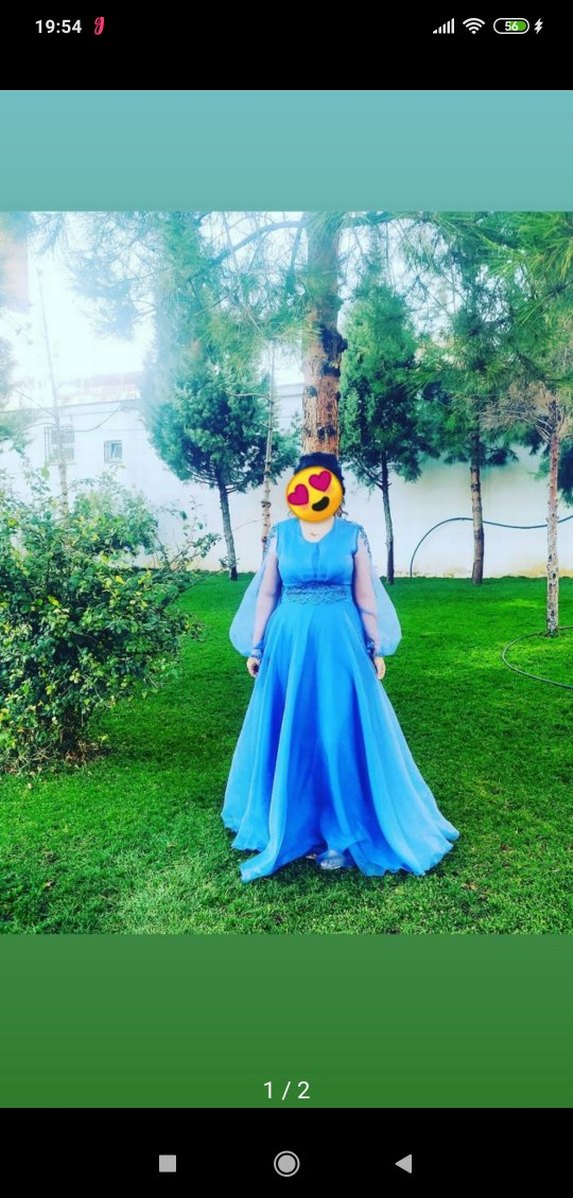 Uzun mavi renkli, bol kesim ve dökümlü detaylara sahip V yaka kadın elbisesi. Uzun kollu ve renkli batik desenlidir, bohem tarzı için uygundur.