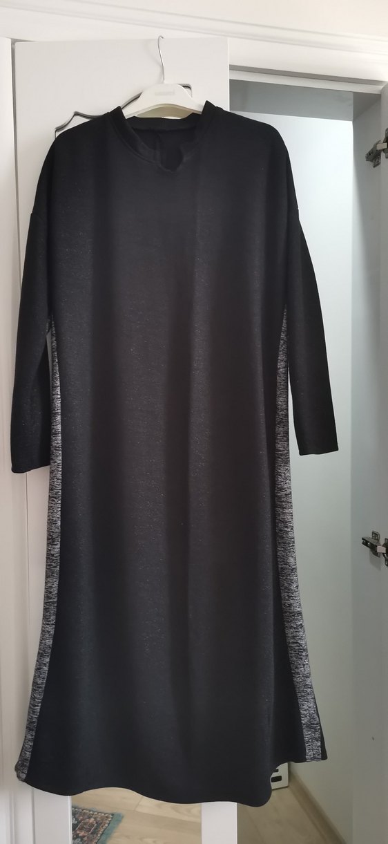 Uzun siyah midi boy elbise, uzun kollu olup, tasarıma sahiptir. Likralı mevsimlik kumaştan kendinden simlidir. Ölçü sorunuz lütfen
