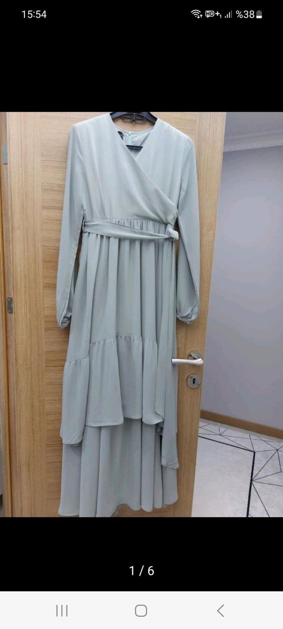 Uzun boyda, drapeli tasarıma sahip elbise. Notch yakalı, askılı kollu, sade ve bohem tarzda, sentetik kumaştan üretilmiştir. Günlük ve mütevazı kullanım için uygundur.