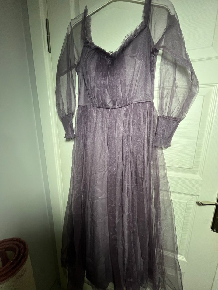 Uzun mor renkte, gevşek kesim ve tek renk olan bu elbise, dısı tülden yapılmıştır. Kayık yaka ve uzun kollu, düğünlere uygundur. 121 cm boyu 37 cm belidir. Kolları tüldür. Arkasından ön kısmına bağlamalı kemeri vardır. Arkasıda düzdür.