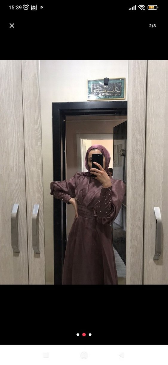 Koyu mor uzun yüksek yakalı ve bol kesimdir. Taşlarında hafif dökülme var onun dışnda hiç bir kusur yoktur (şal hediye)